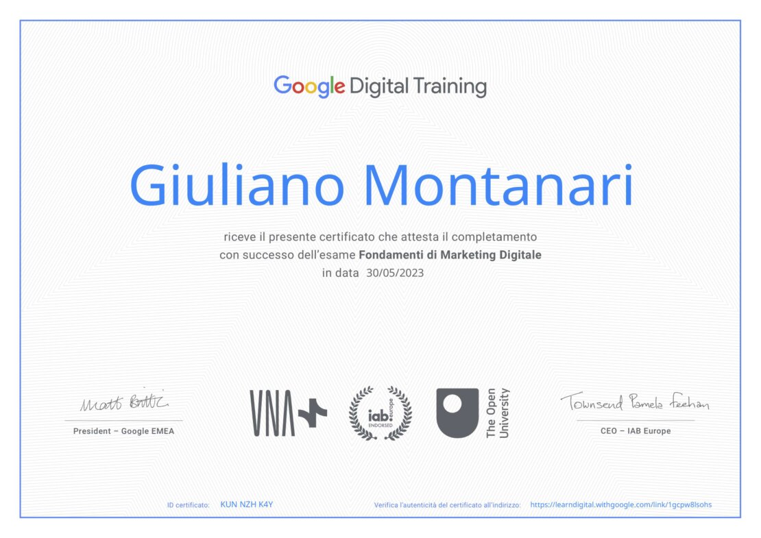 Giuliano Montanari è un professionista del digital marketing con certificazione Google, il che attesta la sua competenza e conoscenza approfondita nel settore. Grazie a un'esperienza consolidata e a un costante aggiornamento sulle ultime tendenze e strategie, Giuliano è in grado di offrire soluzioni personalizzate e innovative per ottimizzare la presenza online dei suoi clienti. La sua professionalità certificata rappresenta una garanzia di qualità, permettendo alle aziende di sfruttare al meglio le opportunità offerte dal mondo digitale. Scegliere Giuliano Montanari significa investire in un partner affidabile e competente per il successo della propria strategia di marketing.
